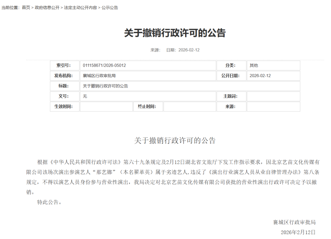 近日,湖北省襄阳市襄城区行政审批局发布关于撤销行政许可的公告,根据《中华人民共和国行政许可法》第六十九条规定及2月12日湖北省文旅厅下发工作指示要求,因北京艺苗文化传媒有限公司该场次演出参演艺人“那艺娜”(本名翟革英)属于劣迹艺人,违反了《演出行业演艺人员从业自律管理办法》第八条规定,不得以演艺人员身份参与营业性演出,该局决定对北京艺苗文化传媒有限公司获批的营业性演出行政许可决定予以撤销。