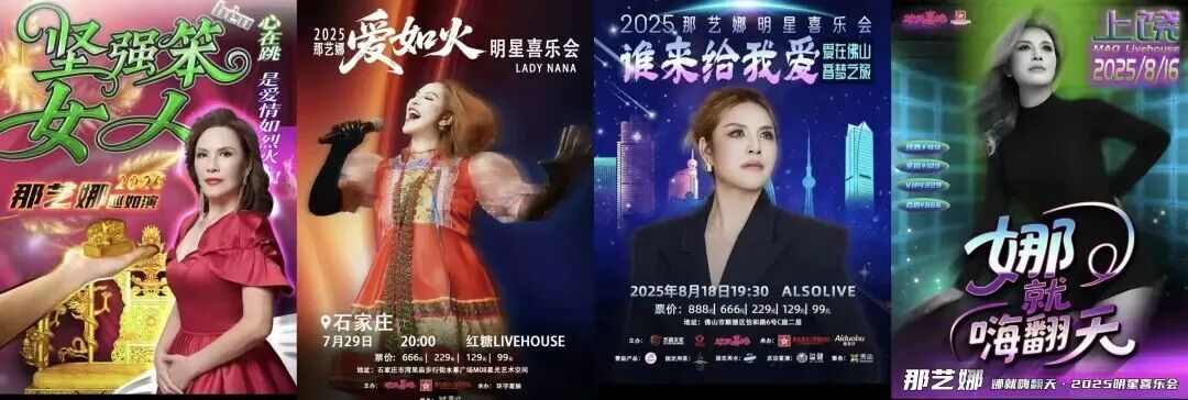 2025年整个6月到8月,58岁的那艺娜都在全国巡演,每场门票几乎都是“秒售罄”。仅8月,她就安排了28场演出,横跨26个城市,有时一日两城。